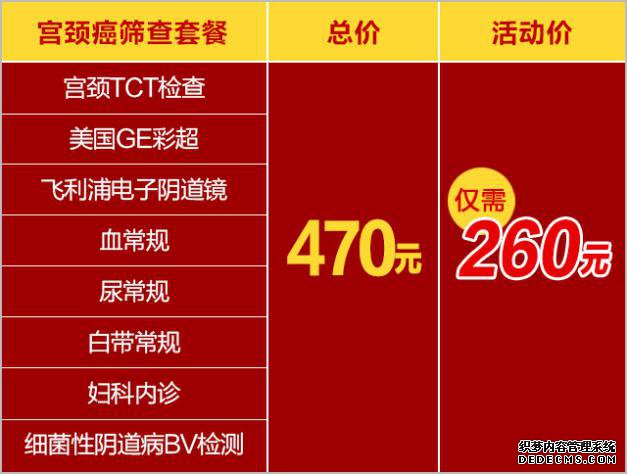 此次活动包含:宫颈TCT检查、美国GE彩超检查、飞利浦电子阴道镜检查、血常规、尿常规、白带常规、妇科内诊、细菌性阴道病BV检测,共计470元,活动期间仅需260元。活动时间截至本月底,女性朋友可抓紧时间参与!